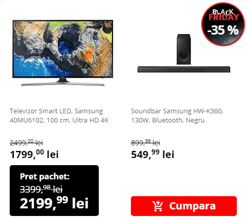 Pachet promo: Televizor Smart LED, Samsung 40MU6102, 100 cm, Ultra HD 4K + Soundbar Samsung HW-K360, 130W, Bluetooth, Negru