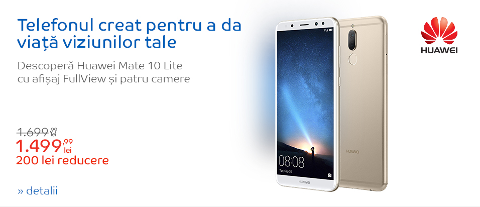 Telefon Mobil Huawei Mate 10 Lite, Dual SIM, 64GB, LTE Display FullView generos si patru camere Fara limite Huawei Mate 10 Lite dispune de un ecran performant de 5.9 inch, orientat catre viitor, care impresioneaza prin calitate; fie ca navigati pe internet, vizualizati clipuri video, cititi carti sau va jucati, rezolutia FullHD + va ofera o experienta incredibila.