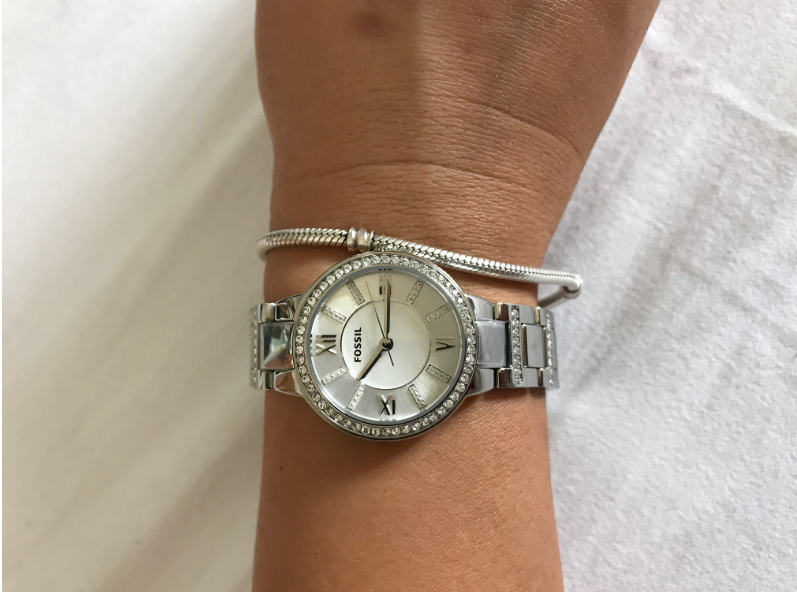 Detalii: cristale pe bratara, coroana si cadran
