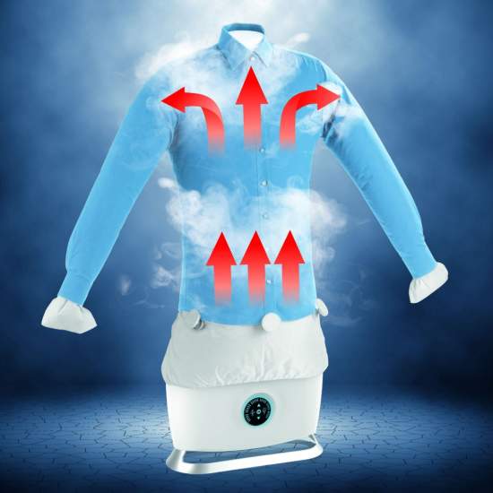 Cu aparatul Steam Ironing Robot, bluzele și tricourile tale sunt uscate și călcate în același timp! Este ideal pentru materialele delicate pentru care nu poate fi folosit fierul de călcat. În plus, Steam Ironing Robot neutralizează mirosurile neplăcute ale hainelor purtate. Gratuit vei primi 5 cleme cu greutate integrată, ce îți vor ține hainele drepte și fixe pe balon în timpul utilizării.