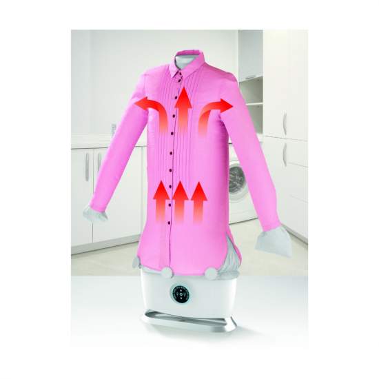 Pe lângă efectul impecabil adus hainelor, cantitatea mare de aburi are și rol igienic de eliminare a bacteriilor de la suprafața țesăturilor. Steam Ironing Robot este foarte ușor de utilizat! Tot ce trebuie să faci este să adaugi apă în rezervor, să așezi bluza peste balonul de nailon și să setezi temporizatorul. Aerul cald va umfla balonul și va pătrunde prin țesătură uscând materialul, în timp ce tensiunea generată de balon va netezi toate cutele. Fiind prevăzut cu fermoare laterale, balonul de nailon îți asigură o uscare perfectă și uniformă tricourilor, bluzelor sau cămășilor cu mărimile cuprinse între S-XXL.