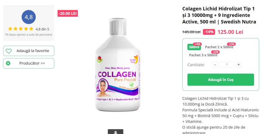 Cura de colagen din decembrie m-a uimit cu rezultatele: pielea mea este mult mai catifelată și strălucitoare, unghiile s-au întărit (pentru prima oară în ani de zile, am unghii sănătoase, care nu se rup) și părul este mult mai tare și nu mai cade. Așa că m-am decis să mai fac o cură de colagen începând cu luna martie – și să respect indicațiile, 3 luni cu 3 luni pauză. Colagenul nu ar trebui să lipsească din alimentația noastră, mai ales că după 35 de ani scade atât producția, cât și rata de absorbție a sa. Aș fi zis că o cură de 20 de zile nu poate produce mari diferențe, însă mi-a depășit toate așteptările. Pentru absorbția bună a colagenului se recomandă asociat cu vitamina C, iar marele avantaj al acestei variante lichide este că e gata pregătită cu vitamina C și are și B-uri și siliciu.