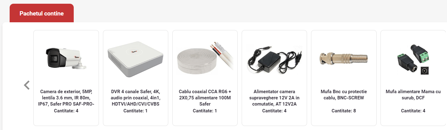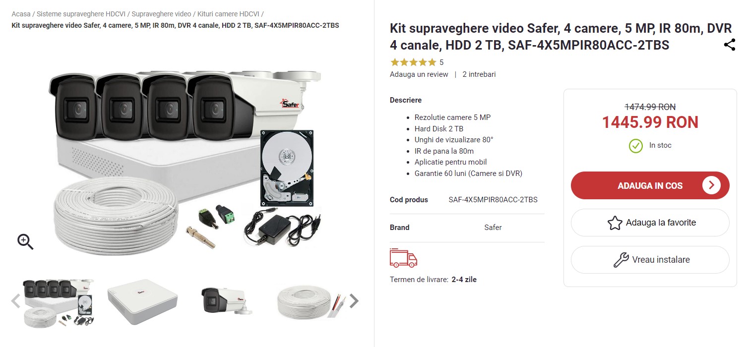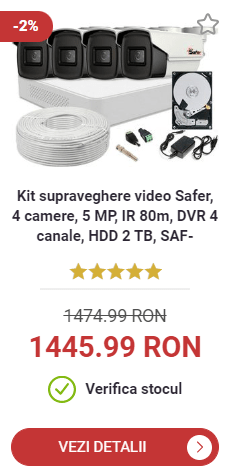 Kitul pentru supraveghere video Safer, 4 camere, 5 MP, IR 80m, DVR 4 canale, HDD 2 TB, SAF-4X5MPIR80ACC-2TBS merită cumpărat deoarece este fiabil, usor de instalat și complet.