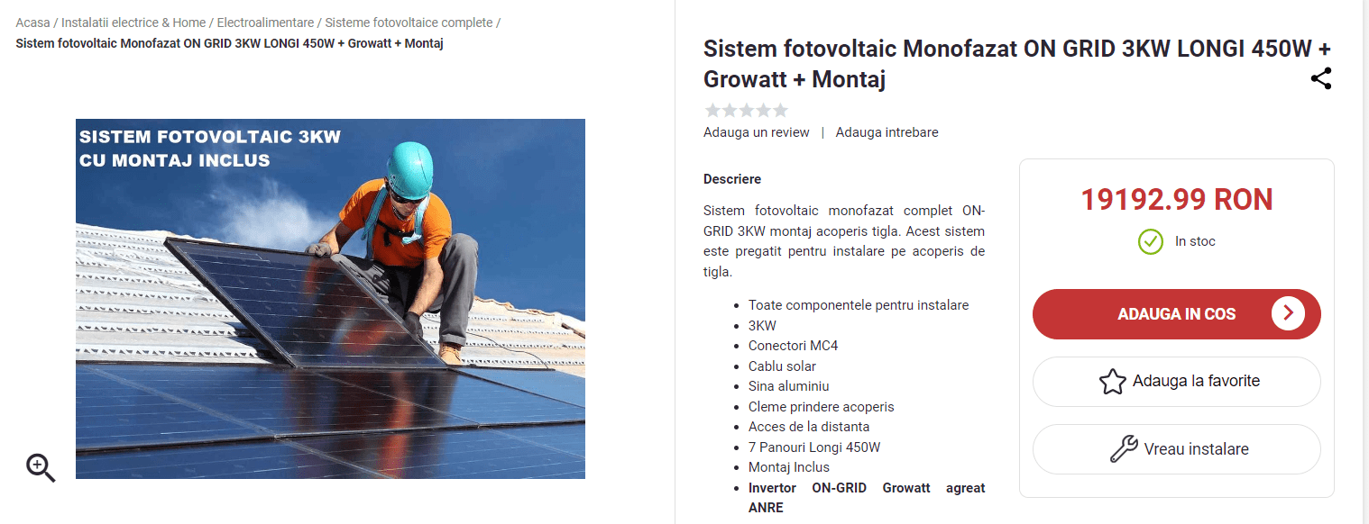 Sistemul fotovoltaic Monofazat ON GRID 3KW LONGI 450W + Growatt + Montaj poate fi cumpărat acum de la magazinul