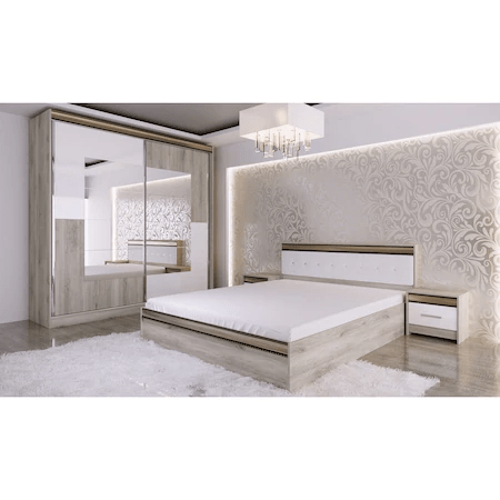 - Caracteristici cheie: Dulapul dispune de două uși glisante și oglinzi centrale, adăugând un aspect elegant încăperii. Patul are un design cu laturi înalte de 30 cm, iar noptierele sunt atât practice, cât și estetice.
