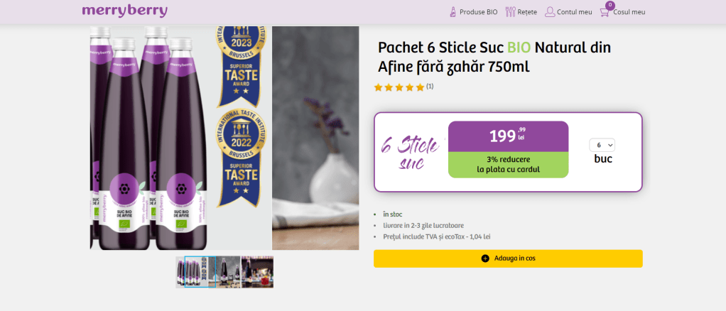 În căutarea unor oferte de excepție care să îți aducă sănătatea la tine acasă? Reduceriastazi.com te aduce pachetul perfect pentru un stil de viață sănătos – 6 Sticle de Suc BIO Natural din Afine fără Zahăr de 750ml de la MerryBerry. Fii gata să te bucuri de gustul minunat al afinelor și de beneficiile unui produs 100% natural, la prețuri reduse!