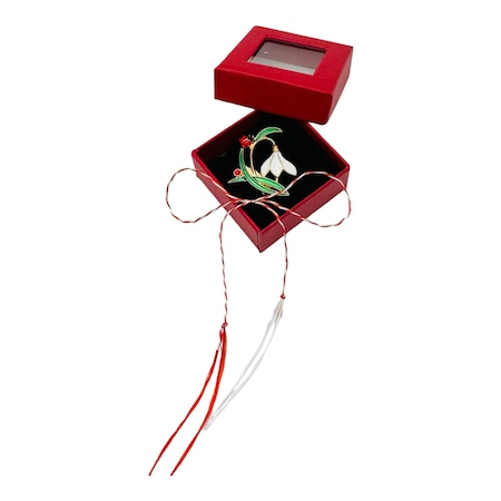 Brosa Martisor Ghiocel Dragalas, in cutiuta rosie cu fereastra, 4.5×4.5×2cm.